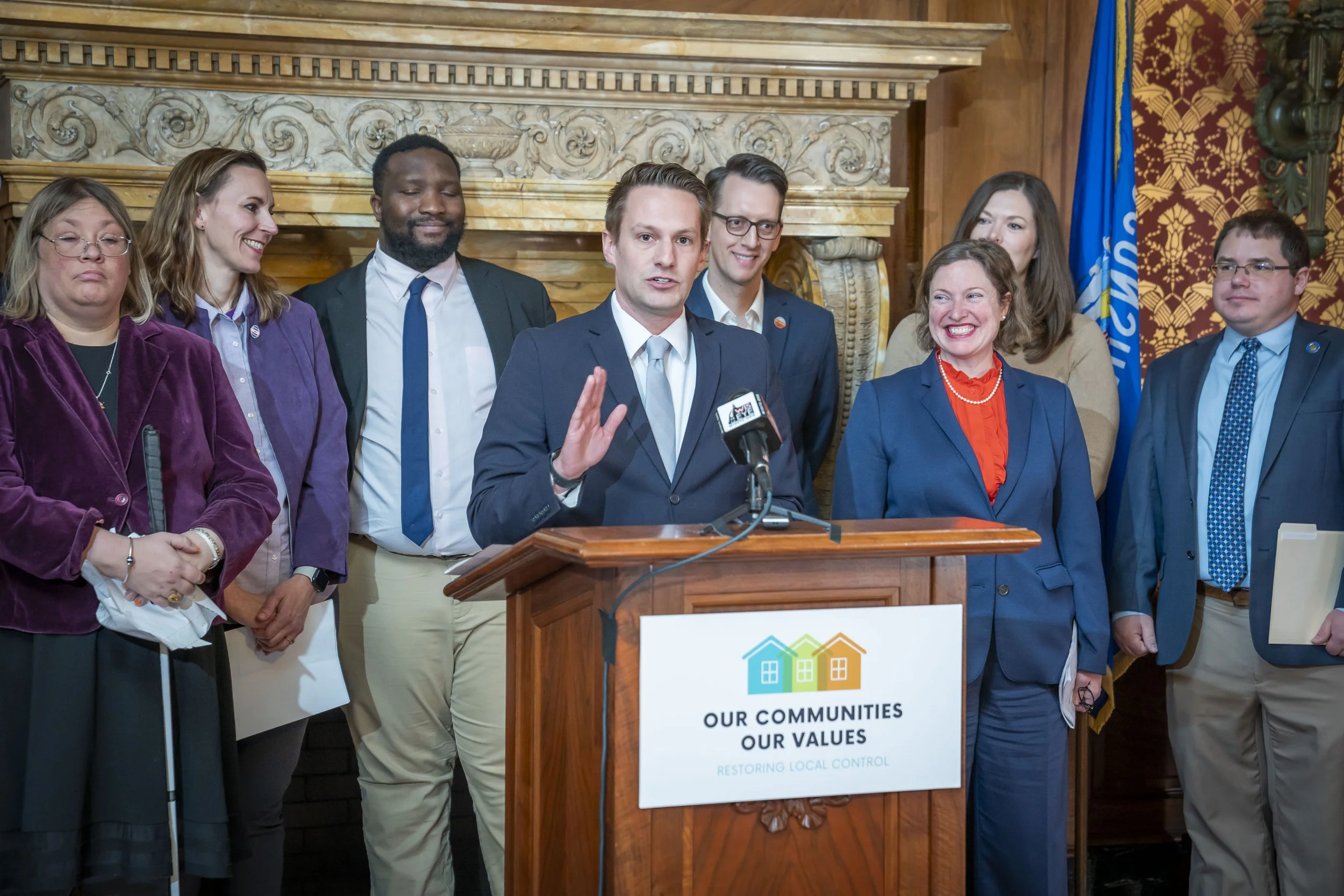 Rep. Joers alongside local officials and legislative colleagues introducing bills to return local control to communities across Wisconsin